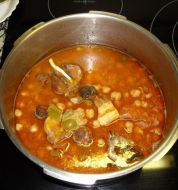 Ingredientes - 350 g de garbanzos - 300 g de bacalao desalado - 2 cebollas medianas - 1/2 pimiento rojo - 1 pimiento verde italiano - 1 diente de ajo - 2 huevos - 2 hojas de laurel - 1 cucharadita de pimentón dulce de la vera - pimienta negra molida - aceite de oliva - sal - --- [...]