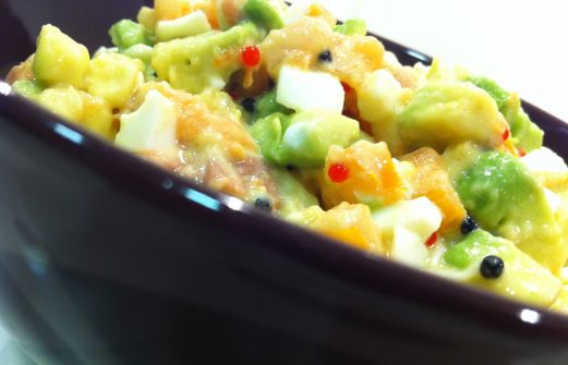 Ingredientes (4 personas): - 1 aguacate grande que no esté maduro - 2 tomates rojos - 150 gr de salmon ahumado - 12 gambas cocidas - 1 clara de huevo cocida - 1 zanahoria - 2 c.s. de mayonesa ligera - Sucedáneo de caviar negro - Huevas de salmón - Aceite de oliva virgen ex [...]