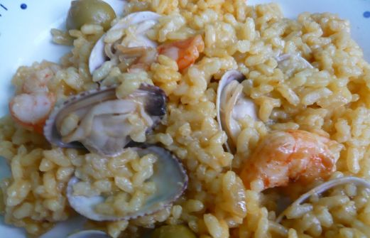 Ingredientes: Arroz, almejas, gambas, cebolla, ajo, azafrán, coñac, caldo de pescado, aceitunas, sal. Coloque las almejas en un recipiente de agua con sal para que suelten la posible arena que tuvieran. En una olla con agua puse las cáscaras y las cabezas de las gambas c [...]