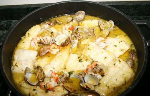 Una merluza, gambas almejas, cebolla, ajo, perejil Rebozar los trozos de merluza salpimentados en un poco de harina y freir ligeramente, se escurre la merluza y se pone en una cazuela. Después en un poco de ese aceite se echa la cebolla picada fina junto con un diente de ajo, pocharlo t [...]