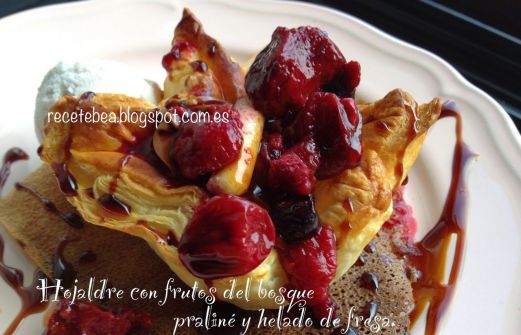 Ingredientes: - Hojaldre. - Huevo batido - Masa brik. 2 ´´laminas redondas. - Frutas del bosque congeladas (en Lidl y Aldi) o frescas. - Praliné o nocilla o nutella. - Crema de vainilla (Dr. Oetker). - Caramelo. - Helado de fresa con galletas (Carrf). Elaboración: Precalen [...]
