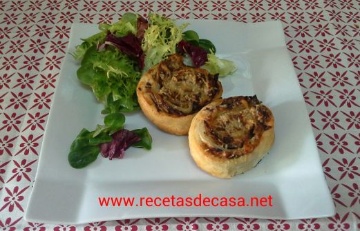 Hojaldre relleno de cebolla caramelizada y champiñones.