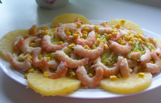 INGREDIENTES: PARA 4 PERSONAS 1KGR DE LANGOSTTINOS 1 LATA DE PIÑA EN SU JUGO 1 MANZANA 1 LECHUGA SALSA ROSA SAL PREPARACIÓN: Se trocea la piña y los langostinos la manzana sin piel y la lechuga se pone todo en un bol y se mezcla con la salsa rosa. Receta de Toñi