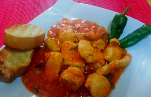 Pollo con salsa picante, picante. Ingredientes: 800 gr. de pechugas de pollo. 2 cebollas. 2 cucharadas de aceite de oliva. 2 cucharaditas de comino molido. 2 cucharaditas de aderezo para pinchos. 2 cucharaditas de pimentón picante. 2 guindillas. 6 pimientos s [...]