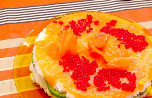 Hoy es un día de cualquier pero he hecho una tarta especial. Es una tarta de sushi. Lleva salmón ahumado, huevo revuelto estilo japonés, aguacate y hueva de salmón. Para otra ocasión podría cambiar pescado. Muy rico.
