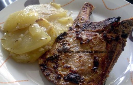 CERDO ASADO AL LIMÓN, arrosto de maiale al limone 800 gramos de chuletas de cerdo 3 limones 1 kilo de patatas 1 diente de ajo, harina pimienta blanca, romero, laurel 1. enharinar las chuletas de cerdo 2. pelar y cortar las patatas en rodajas 3. en una fuente para horno poner las [...]