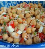 Ingredientes: 1 bote pequeño de garbanzos 1 Tomate de ensalada 1 pimiento blanco 1 cebolla blanca 1 puñado de almendras tostadas sin sal 1 par de bayas de goji y pasas 1 par de pipas peladas Introducción: Mezclar todos los ingredientes en una ensaladera.