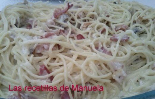 INGREDIENTES PARA 3 RACIONES 75 g de cebolla 2 dientes de ajo 50 g de aceite de oliva virgen extra 150 g de beicon ahumado en trozos 250 g de champiñones frescos en cuartos 200 g de nata para cocinar 1 1/2 cucharadita de sal 1200 g de agua 1 cucharadita de orégano seco 300 g de espagu [...]