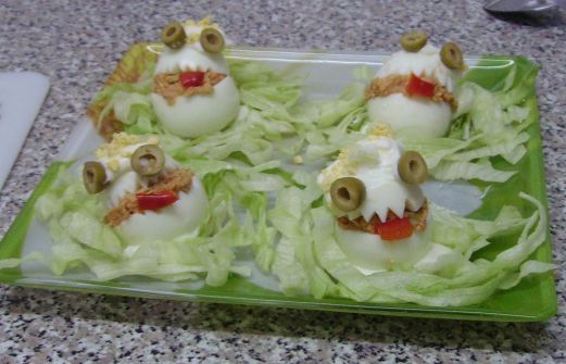 INGREDIENTES: - 6 huevos duros - 1 pimiento morròn - 20 gr de aceitunas sin hueso - 80 gr de atùn escurrido - 40 gr de tomate frito - mayonesa para decorar - lechuga cortada en juliana para los nidos PREPARACIÒN: Hacer nidos de lechuga en un plato y en el centro p [...]