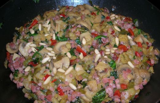 berenjenas Rellenas de verduritas y jamon de york 2 berenjenas pimiento rojo y verde cebolla champiñones unas hojitas de espinacas 1 tomate piñones daditos de jamon york queso mozarella rrallado sal,pimienta,aceite de oliva partimos las berenjenas a la mitad y sacamos la carne ,d [...]