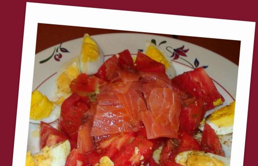 Ingredientes: 1 Tomate grande 2 ó 3 lonchitas de salmón 2 Huevos cocidos Aceite, sal y comino molidos Elaboración: Cortar el tomate en trozos, añadir el salmón y el huevo, rociar con aceite, sal y comino molido.
