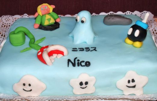 Tarta de fondant personalizada para Nico, con su nombre en español y japonés y personajes de sus videojuegos favoritos.Rellena de crema de mantequilla de dulce de leche. Podeís personalizarla con otros videojuegos y personajes, y del relleno que mas os guste.