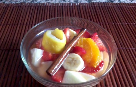 INGREDIENTES 1 manzana 1 naranja 1 platano 6 fresas 4 rodajas de piña 1 vaso de agua 1/2 vaso de azucar 1 palo de canela 1 trozo de piel de limon PREPARACION En un bol hondo picar toda la fruta menuda , mientras en un cazo poner el agua , azucar , canela y piel de limon , hervir 5 minutos y [...]