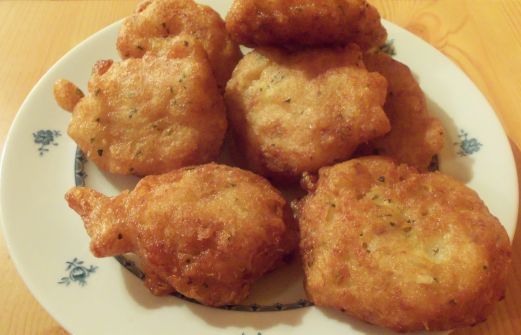 150gr Bacalao desalado. 150gr Agua. 150gr Harina. 2 Dientes de ajo. 1 Cdita. levadura. 2 Yemas de huevo. 2 Claras de huevo. Sal. Aceite. Calentamos el agua en un cazo, cuando esté templada echamos la harina y la levadura y movemos hasta obtener una masa. Dejamos enfriar. Cuando esté frÃa, a [...]