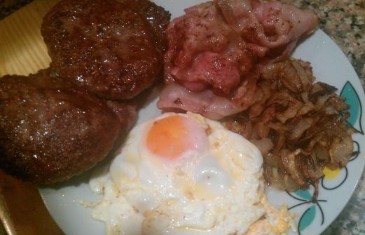 Unas ricas y jugosas hamburguesas... Se pueden hacer muy variadas. Yo las hago con cebolla doradita, beicon, huevo y queso. Para empezar haremos la cebolla porque es lo que mas tarda Seguidamente hacemos las hamburguesas. Después freímos el huevo y por ultimo el beicon.