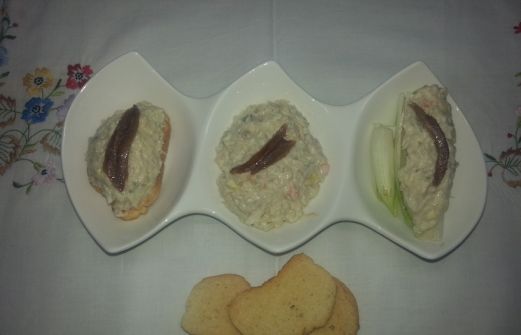 Ingredientes: 4 patatas medianas hervidas. 50 grs. Olivas rellenas. 2 latas de atún en aceite. 200 grs. Variantes escurridos. 4 huevos duros. mayonesa. alioli. Elaboración: Hervir las patatas, las pelamos. Aquí se ven más patatas, porque hice para mucha gente. Las chafamos [...]