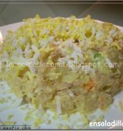INGREDIENTES 200 grs de patatas. 200 grs de guisantes. 200 gras de zanahorias. 200 gras de judias verdes finas. o bien una bolsa de ensaladilla congelada. 2 latas de atún. 125 gras de olivas rellenas. 125 gras de pepinillos en vinagre. 3 huevos duros. 500 grs de mayonesa (o algo más) Opcional: [...]
