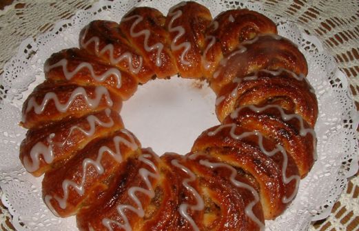 Rosca de masa de bolleria hojaldrada,rellena de nueces con datiles finamente picados ,un chorrito de ron y un poco de miel .