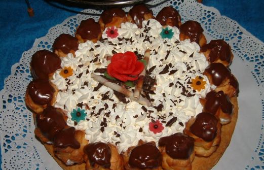 LA RECETA: Base de hojaldre (yo la rellene de almendra) decorada al rededor con los profiteroles en el centro una mousse de chocolatey encima nata montada puesta con manga rizada,encima de los profiteroles salsa de chocolate (nata y chocolate fundido)y adornos ,yo puse unas flore [...]