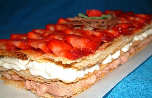 Ingredientes: Una lámina de hojaldre Trufa (nata montada con chocolate puro en polvo y azucar) Nata montada azucarada Fresas Un poco de almibar cocido con un par de fresas Se pone el hojaldre en la placa de horno y se pincha para que no suba muchoy se pone una bandej [...]