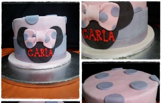 Esta tarta era para una niña que cumplió su primer añito y su abuela me especificó que debía tener cosas de Minnie Mouse; así que así lo hice... Una tarta con bizcocho de vainilla, rellena con buttercream sabor a fresa y de color fucsia; cubierta con ganaché de chocolate y forrada con f [...]