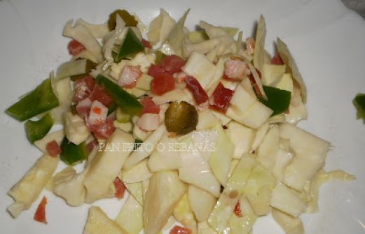 He aquí una ensalada muy completita, y una manera diferente de comernos el repollo. En mi casa nos encanta así en crudo y picadito fino se pasa estupendamente sin que las niñas digan ni mú. Ingredientes: 1 repollo blanco. 1 pimiento verde. 100 gr. de aceitunas verdes o pepinillos en v [...]