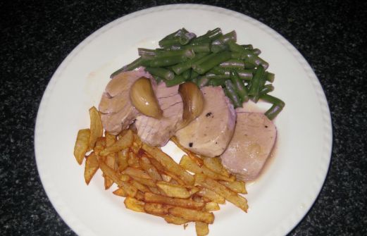 Ingredientes - 2 Solomillos de cerdo - 8 dientes de ajo - sal, pimienta, una copita de whisky, vino blanco, aceite de oliva. - judías verdes y patatas - 1 pastilla de caldo de carne Poner en una cazuela un poquito de aceite de oliva y rehogar los solomillos enteros salpime [...]