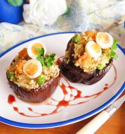 Si, las berenjenas admiten muchos rellenos, yo tengo publicadas estas con huevo de codorniz (aquí) y estas otras con frutos secos y pan (aquí) ambas sin carne, como las que os presento hoy. Es fácil recurrir a la carne picada, aunque en casa no gusta demasiado, por eso, como admiten muc [...]