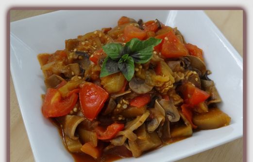 - En un chorrito de aceite , saltear 1 cebolla cortada en juliana; añadir 2 berenjenas peladas y cortadas en dados, con un poco de sal y pimienta . Saltear, añadir un chorrito de vino blanco y dejar evaporar. - Añadir ¼ kg. de champiñones laminados y espolvorear con polvo de boletus . Pasa [...]