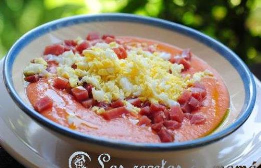 1 kg tomates maduros 200 g pan de telera 100 ml aceite de oliva virgen extra 1 diente ajo sal huevo cocido jamón picadito Preparación Se limpian y se trituran los tomates con la ayuda de una batidora o un robot de cocina. Se pasa por u [...]