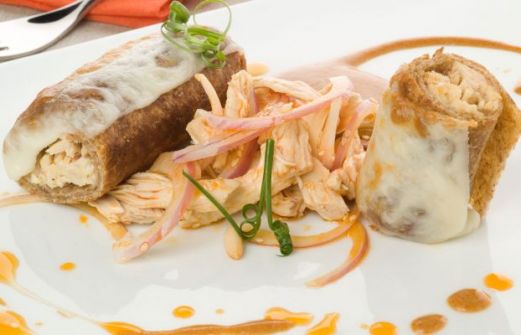 - Para 2 personas - 4 tortillas de maíz 1 pechuga de pollo 4 lonchas de queso semicurado 1/2 zanahoria 1/2 rama de apio 1 diente de ajo 15 g de piñones 10 g de sésamo blanco agua aceite de oliva sal pimienta una rama de perejil PARA LA SALSA DE MOLE: 2 cucharadas de pasta de ca [...]