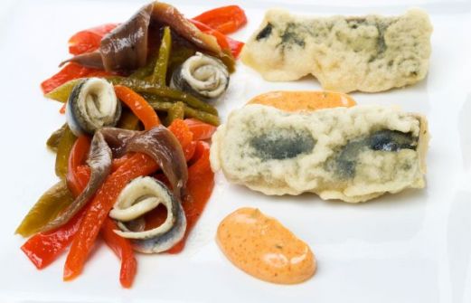 - Para 2 personas - 1 verdel de 400 g 10 filetes de anchoa en vinagre 10 filetes de anchoa en salazón 3 pimientos rojos del piquillo 3 pimientos verdes del piquillo 1 diente de ajo 50 g de harina de trigo 50 g de harina de arroz harina para rebozar 2 cucharadas de mayonesa agua ac [...]