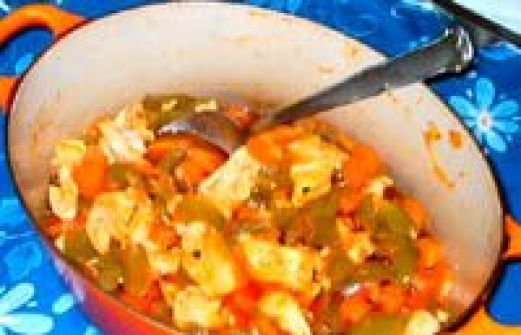 para 6 personas - 1 brocoli - 1 caldo de pollo, pastilla - 1 cebolla grande - 500 gramos de pechugas de pollo - 1 ramito de perejil - 1 pizca de pimienta a gusto - 1 pimiento rojo grande - 1 pimiento verd [...]