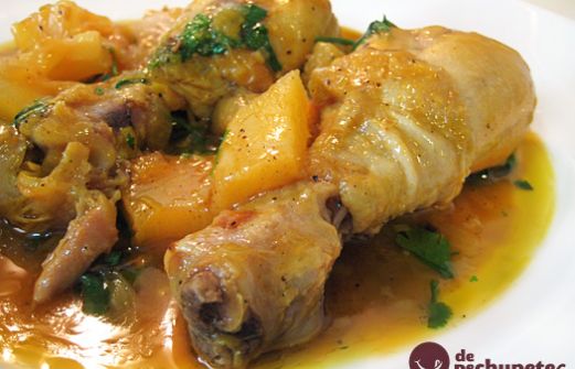1 pollo campero o de casa entero (troceado para guiso) 2 Cebollas grandes 4 dientes de ajos 50 ml de aceite oliva virgen extra Ilove 2 puerros 1/2 jengibre fresco 1 bote de 480 g de piña en su jugo (10 rodajas) Sal y pimienta negra molida (al gusto) Tomillo y nuez moscada (para el pol [...]