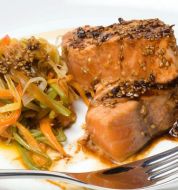 - Para 2 personas: 1 lomo de salmón de 300 g 10 espárragos verdes 16 judÃas verdes 50 g de espinacas 1/2 calabacÃn 1 yema de huevo 2 nueces de mantequilla 1/2 limón agua 1 copa de vino blanco aceite de oliva sal pimienta perejil picado Elaboración Limpia el salmón, retira la [...]