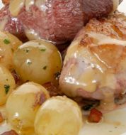 - Para 2 personas: 1 magret de pato 50 g de foie fresco 100 g de alubias blancas cocidas 1 patata 1 manzana 25 g de queso  agua aceite de trufa aceite de oliva sal pimienta perejil 1 ramita de canela Elaboración de la receta de pechuga de pato con tres purés Para el puré de p [...]