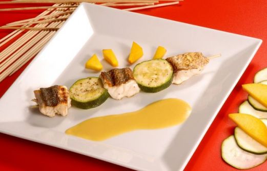 - Para 4 personas: 600 gr. de lubina limpia 1 calabacÃn 4 melocotones 50 gr. de panceta 1/2 l. de caldo aceite virgen extra vinagre de Módena sal pimienta Elaboración Pica la panceta en dados y ponlos a rehogar en una cazuela con un poco de aceite hasta que se doren. Pela los me [...]