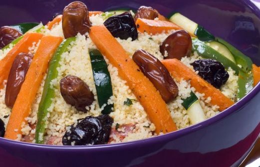 ?- Para 4 personas: 1 botillo 200 g de sémola de trigo (cous cous) 1 pimiento verde 1 rueda de calabaza 1/2 calabacÃn 400 g de pimientos rojos asados 2 ciruelas pasas 4 dátiles 1 cucharada de azúcar agua vinagre aceite de oliva sal pimienta hojas de menta hojas de albahaca E [...]