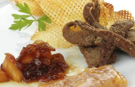 4 filetes de hÃgado de ternera 2 patatas 2 dientes de ajo pan rallado aceite virgen extra sal pimienta negra 2 cebollas rojas 1 manzana 1 cucharada de azúcar 1 vaso de vino blanco 250 gr de mantequilla aceite virgen extra sal 1 hoja de laurel - Para la confitura de kaki: 3 kak [...]
