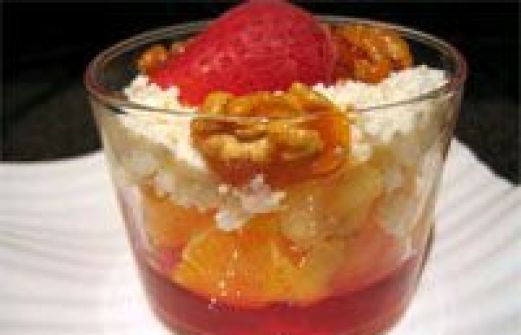 para 2 personas - 5 cucharadas de azúcar - 2 fresones - 2 cucharadas de miel - 1 naranja - 1 pera - 1 plátano - 1 puñadito de nueces - 100 gramos de requesón - 1 sobre gelatina de fresa [...]