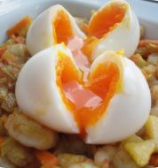 para 4 personas - 4 huevos frescos - 0,5 cucharaditas de vinagre de elaboración: Se llena hasta la mitad una sartén con agua y se añade el vinagre. Se lleva a punto de ebullición. Se cascan los huevos de uno en uno sobre un plato para deslizarlos rápid [...]