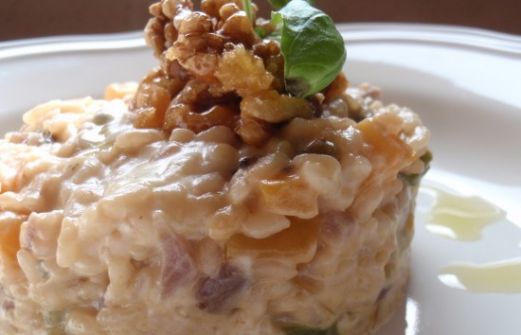 Ingredientes para 4 personas (tiempo aproximado de preparación 35 minutos): - 4 tacitas de arroz . - 1 pechuga de pollo . - 2 manzanas. - 1 apio . - 30 grs. de nueces peladas . - 1 cebolla. - 2 cucharadas de queso parmesano rallado . - 9 tacitas de caldo de verduras. - 3 cuch [...]